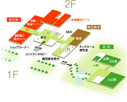 越前焼をより深く知り、より身近に感じていただくために、「資料館」では越前焼のさまざまな魅力をご紹介しています。併設された「陶芸教室」では、手ひねり、絵付けなど、お子様からご年配の方まで、つくる楽しさを気軽に体験していただけます。また「茶苑」では本格的茶室・越知庵などで、四季折々の表情を見せる庭園を眺めながらお抹茶を楽しんでもいただけます。