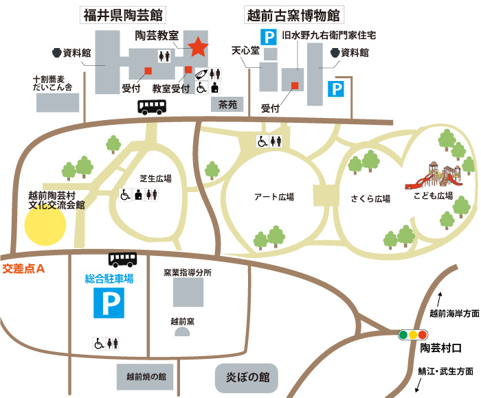 バスでお越しの際は、交差点Aで右折し福井県陶芸館前で一時停車して乗降していただけます。